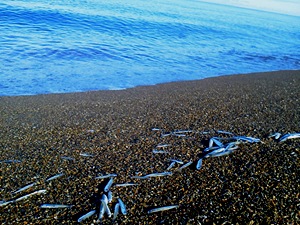 スゴイ!!ハンパなくイワシが逃げまとい、一斉に浜に身投げしてうちあがった!!