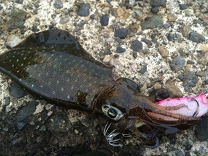 反応がないまま、ナイトエギングに変更。するとすぐに結果が!声をかけ狙いをイカに。