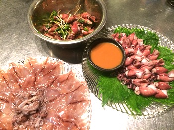 ホタルイカの刺身・ホタルイカのかいわれキムチ和え・ホタルイカのボイル、辛子味噌和え